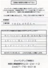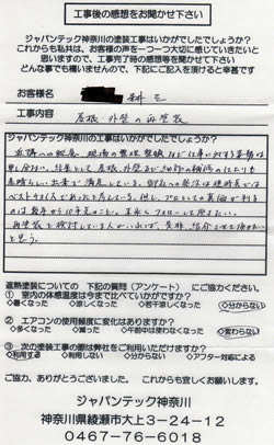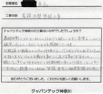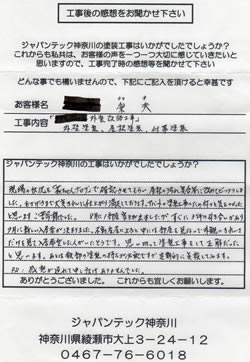 ≪ジャパンテック神奈川 山本 ・ 萩原のコメント≫ お世話になりました。 職人スタッフ・管理スタッフともに喜ばしい評価を頂けて、 大変嬉しく思います。 これからも、多くのお客様に喜んで頂けるように精一杯の対応を続けて行きたいと思います。 誠に、ありがとうございました。 |