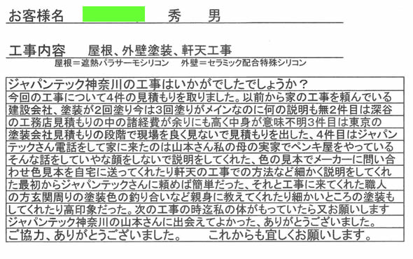 《お客様の声》 業者選びに当たっては数社に見積もりを頼みました。 来宅時の屋根にのぼってもらい、状態を説明していただき、かつ、こちらの質問に対する回答が、最も的を得ていました。 また押し売り的なしつこさもなくジャパンテックさんに決めました。 料金は平均的な価格でした。 工事は丁寧に行ってくれました。 外壁の色も迷いましたがこの色で正解でした。近所の方からも良い色ですねと言って頂けました。 唯一の気がかりは、工程表の提示がなかった事です。 工事の『見える化』頑張ってください。 今後ともよろしくお願いいたします。 |