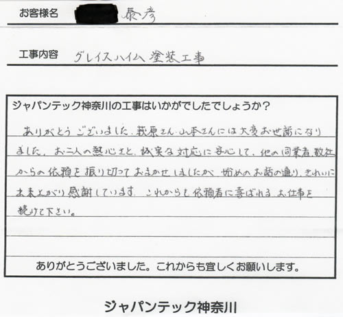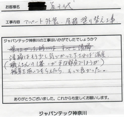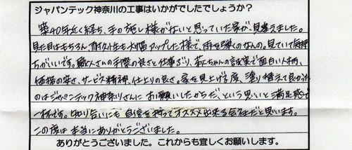 | インターネットでジャパンテック神奈川さんを偶然知りました。 1級塗装技能士の萩原さん、山本さんのお充分な説明と共に、 グループの青年たちのキビキビとした仕事ぶりに感動の毎日でした。 仕上がりは隅々ていねいで、とてもきれいでした。 完成までに管理者お二人が3回程チェックにこられました。 また、現場責任者の金子さんが青年たちが帰ったあと、家が近いから と言われて毎日、 その日の仕事を一つ一つ確認をされて、何人もの眼で徹底した作業管理をされていました。 このような、得がたい企業は、社会で守り育てて行きたいと思います。 塗装考えておられる人は、声をかけてみて下さい。 全く知らない間にキャンパステープを(2ヶ所)巻き直しをして下さったり。 これもうれしい事の一つでした。 皆様のご多幸を祈ります。 |