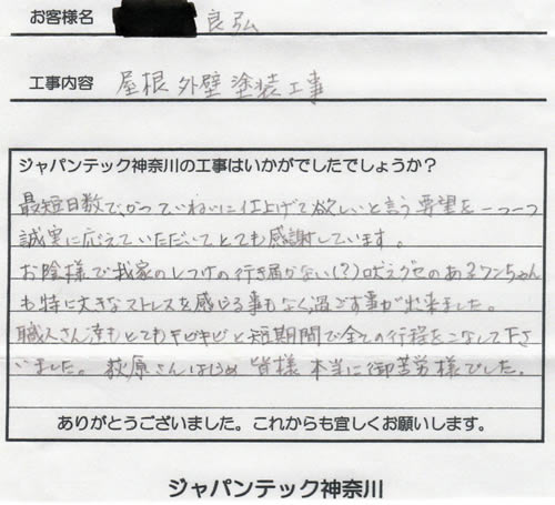 | 築40年近く経ち、手の施し様がないと思っていた家が見違えました。 見た目はもちろん、耐久性も大幅アップした様で、雨を弾くのなんの。 見ていて気持ちがいいです。 職人さんの手際の良さと仕事ぶり、萩ちゃんの誠実で面白い人柄、 価格の安さ、サービス精神、仕上がりの良さ。 家を見上げる度、塗り替えて良かったのはジャパンテック神奈川さんにお願いしたからだ、という思いと満足感で一杯です。 知り合いにも自信を持っておススメ出来る会社だと思います。 この度は本当にありがとうございました。 |