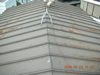 トタン屋根の下地調整とはケレン作業の事じゃ。ケレン作業とは、鉄用のカミヤスリの様な物で念入りに削る作業じゃ。 非常に重要な作業で、もし行わなかったり、手を抜いたりすると将来的に早い段階でハガレてくるんじゃ。 |